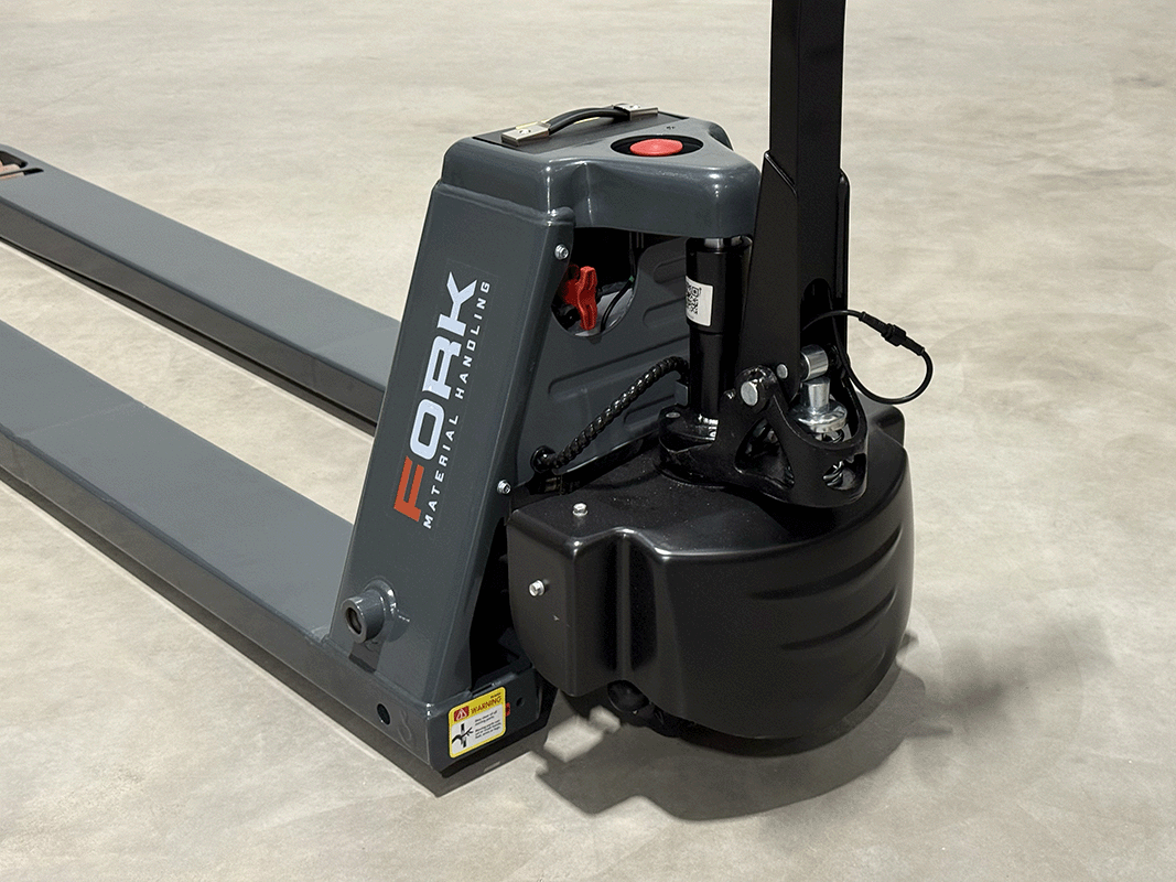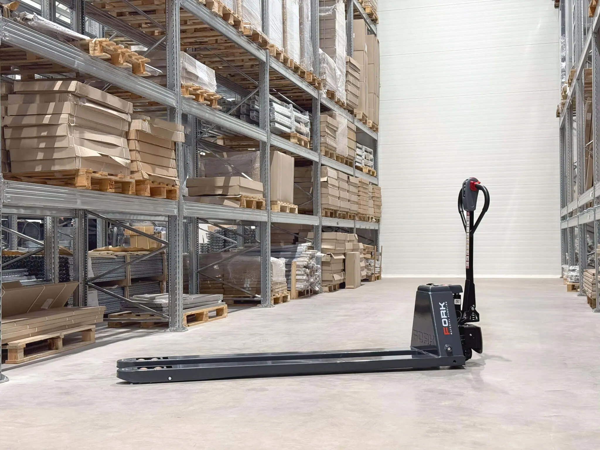 The long electric pallet cart is equipped for lithium-ion batteries. Equipped with lithium-ion batteries, the electric pallet cart is an electric truck system that helps warehouse workers lift and move pallets without using human physical force. The lithium-ion battery operates lifting and running mechanisms.